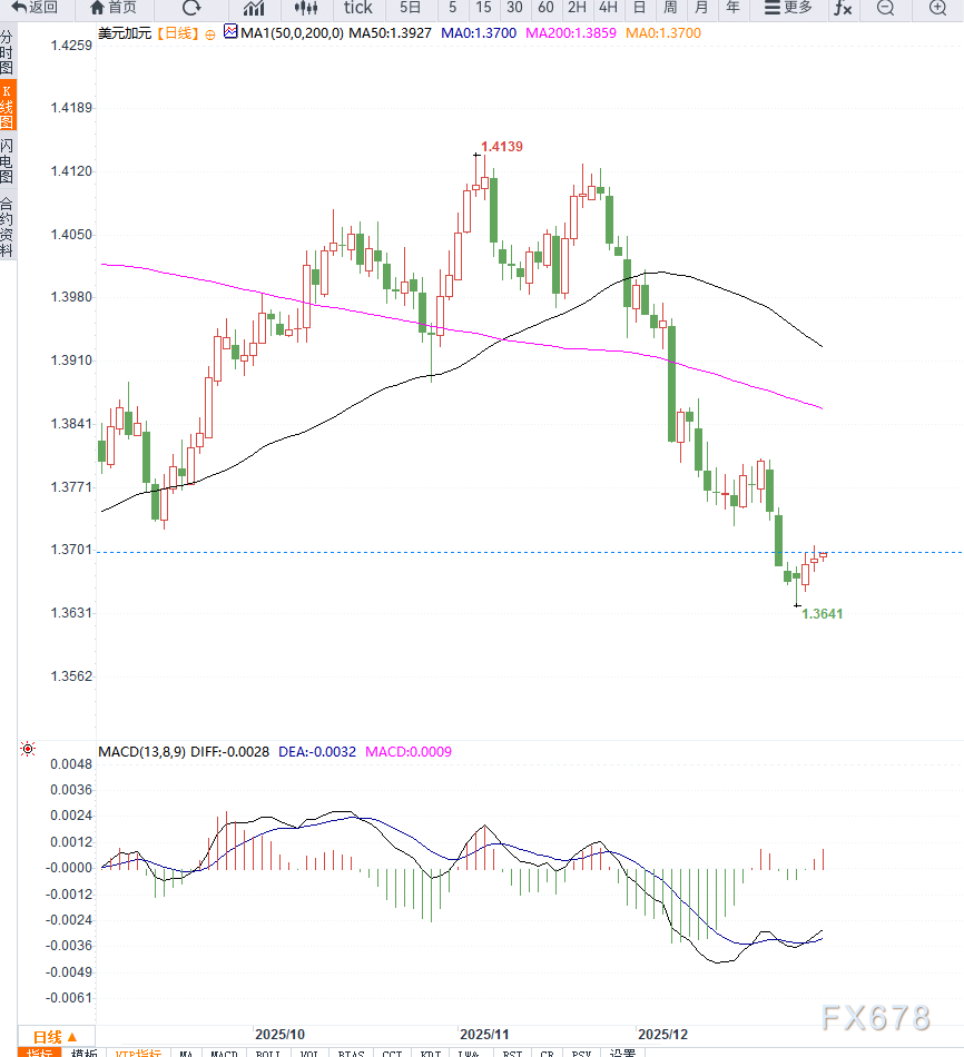 MACD贴近零轴运行,尚未给出明确趋势信号。整体而言,在缺乏新的基本面催化前,USD/CAD更可能维持在1.3650—1.3750区间内震荡。