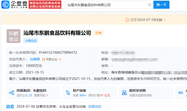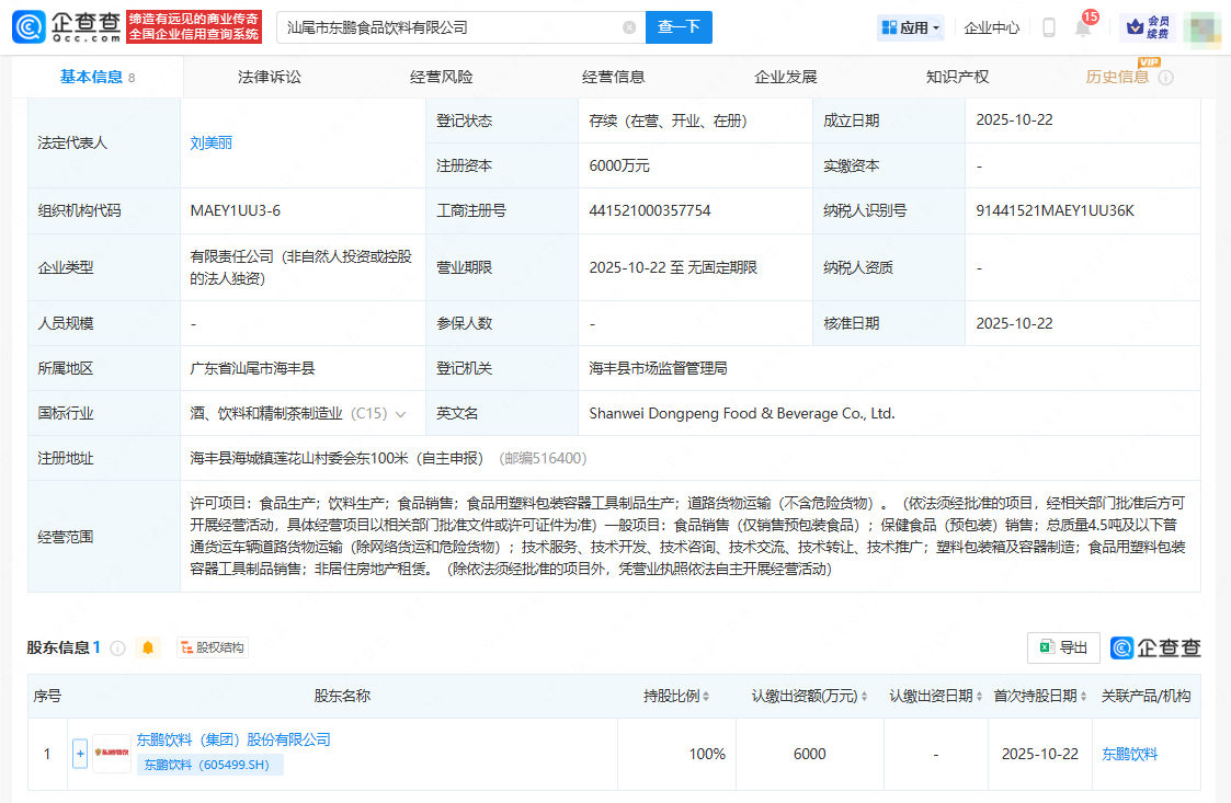 近日,汕尾市东鹏食品饮料有限公司成立,法定代表人为刘美丽,注册资本6000万人民币,经营范围含食品生产、饮料生产、食品销售、食品用塑料包装容器工具制品生产、道路货物运输、保健食品销售、非居住房地产租赁等。企查查股权穿透显示,该公司由东鹏饮料(605499)全资持股。此前,东鹏饮料曾于2021年在汕尾成立东鹏食品饮料有限公司,后于2024年7月注销。