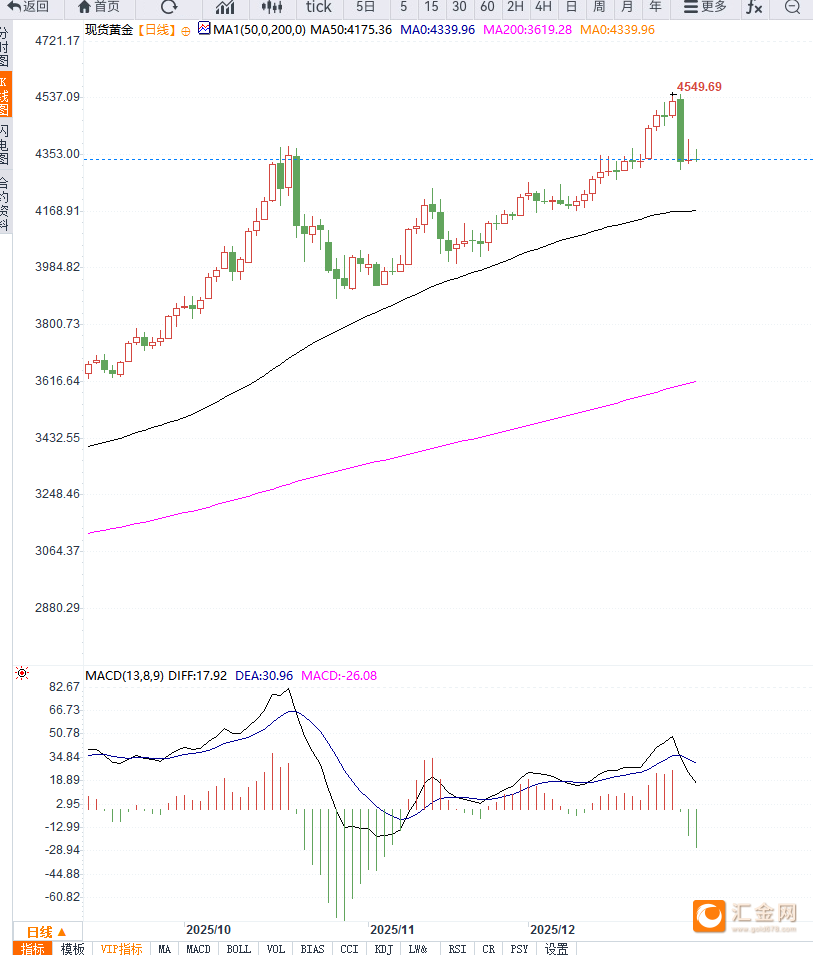 上方初步阻力位位于4520美元(布林带上轨),若有效突破,金价有望测试4550美元历史高位,并进一步指向4600美元心理关口。下方支撑关注4300美元区间,若回调加深,或下探4271美元附近。