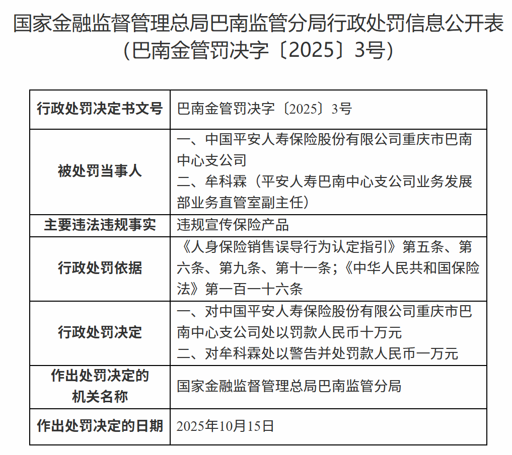10月24日,国家金融监督管理总局巴南监管分局行政处罚信息公开表显示,中国平安人寿保险股份有限公司重庆市巴南中心支公司因违规宣传保险产品被罚款人民币十万元,对牟某霖处以警告并处罚款人民币一万元。